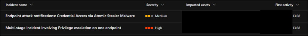 Shown below is the initial alert, indicating credential access via Atomic Stealer malware and a multi-stage incident involving privilege escalation:
