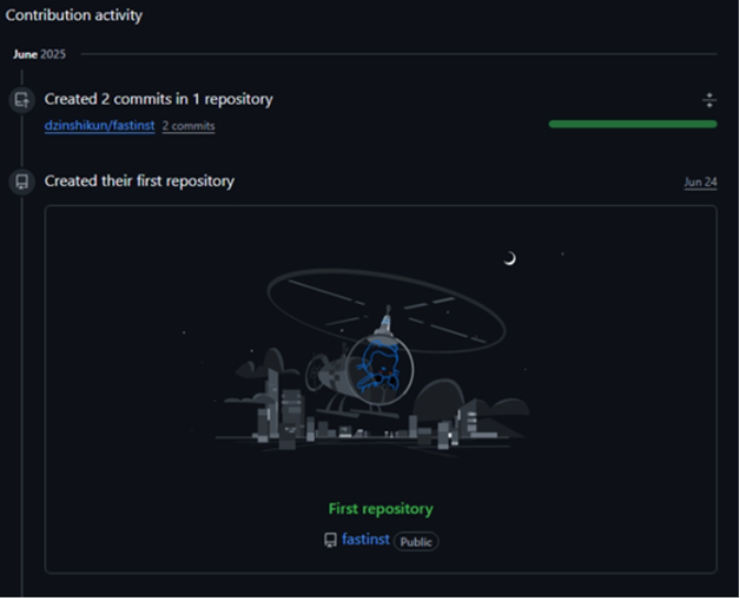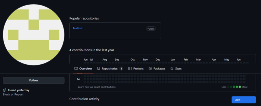 Notice that the GitHub account has zero previous activity, joined ‘yesterday’ and their only repository, which was created the same day, is named ‘fastinst’.