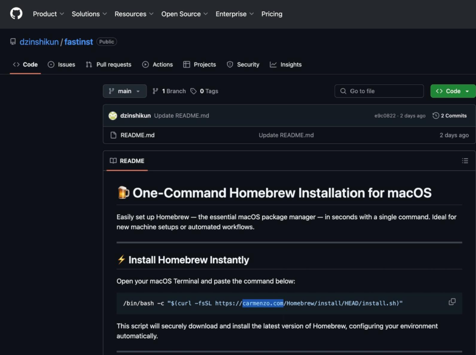 The repository shows a ‘One-Command Homebrew Installation for macOS’, however, this command is reaching out to their malicious domain, and it will definitely not ‘securely download and install the latest version of Homebrew’.