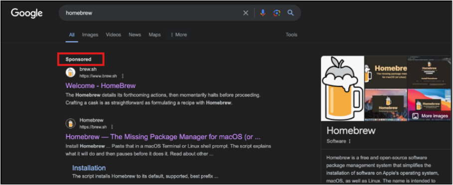 We observed a similar attack pattern throughout 2025, where threat actors abused Google Ads and typosquatted domains to steer users to malicious lookalike sites, such as the spoofed Homebrew page shown below.