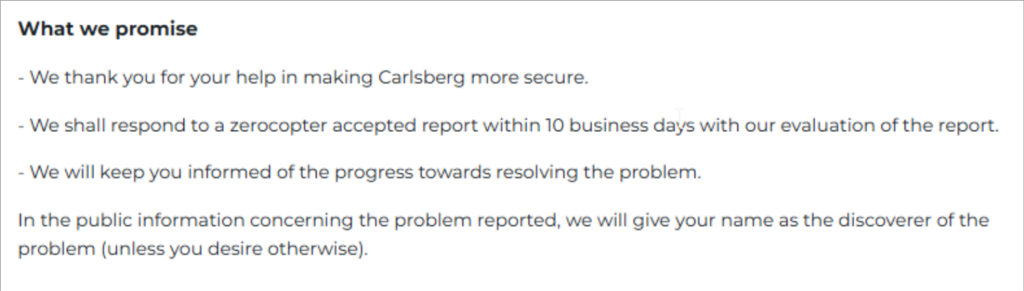 The Carlsberg Vulnerability Disclosure Policy reads well and encourages disclosure through Zerocopter. They have a list of promises about keeping in contact and even have a cool Hall of fame where they list previous researchers who have disclosed vulnerabilities. Unfortunately, I don’t think I’m going to be on that list…