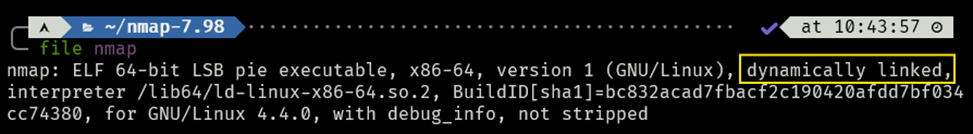 If we directly compile the source code provided in Nmap’s GitHub repo, we will end up with a dynamically linked binary, which again serves no purpose in this scenario: