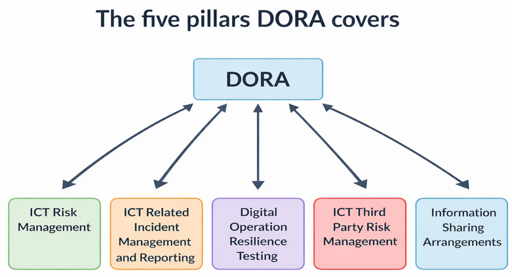 - It is built around five pillars covering risk management, incident reporting, resilience testing, third-party oversight, and information sharing.