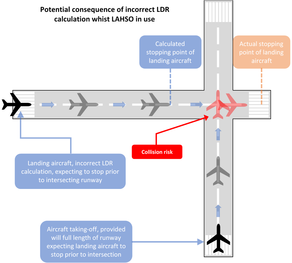 Pilots carry out a calculation of their landing distance and assess whether they can land and stop prior to any intersections on LAHSO runways. If the LDR is close to or over the distance available prior to the intersection, increased deceleration (more braking / flap) would be needed – the alternative is to either refuse LAHSO or request a different runway. If the LDR was miscalculated pilots may believe they can land and stop prior to any intersecting runways, leading them into a false sense of security. The point at which this would become apparent would be when the aircraft fails to stop in time – i.e. too late. The result would be a potential runway incursion with the amplified threat of two aircraft colliding.