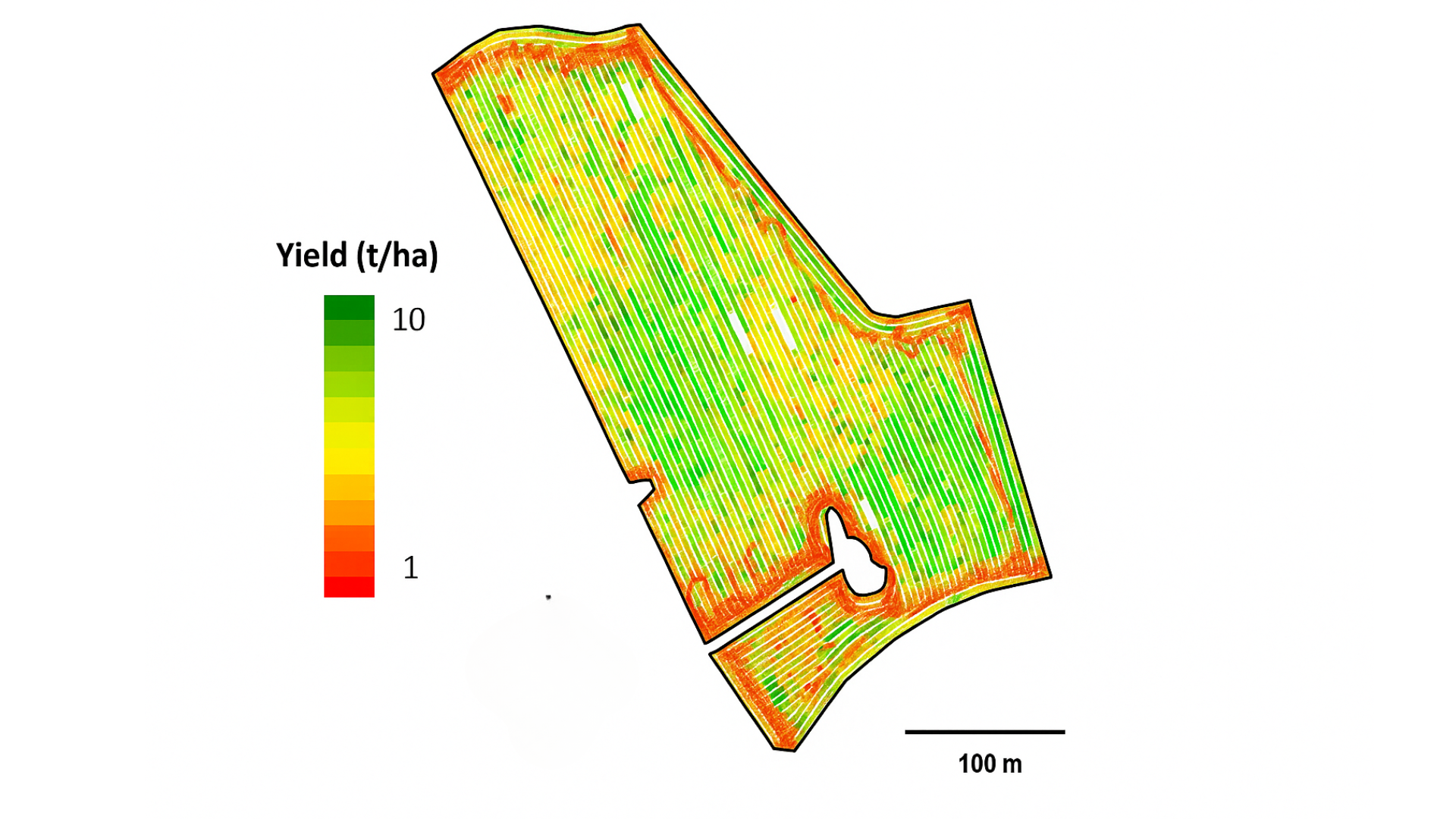The image below shows an example yield map, with colours indicating the amount of crop harvested from each part of the field. Green areas represent higher yields, while red areas show poorer performance. This data helps farmers understand variability across their land and plan future improvements, such as adding more fertiliser to certain parts of a field to encourage better growth.