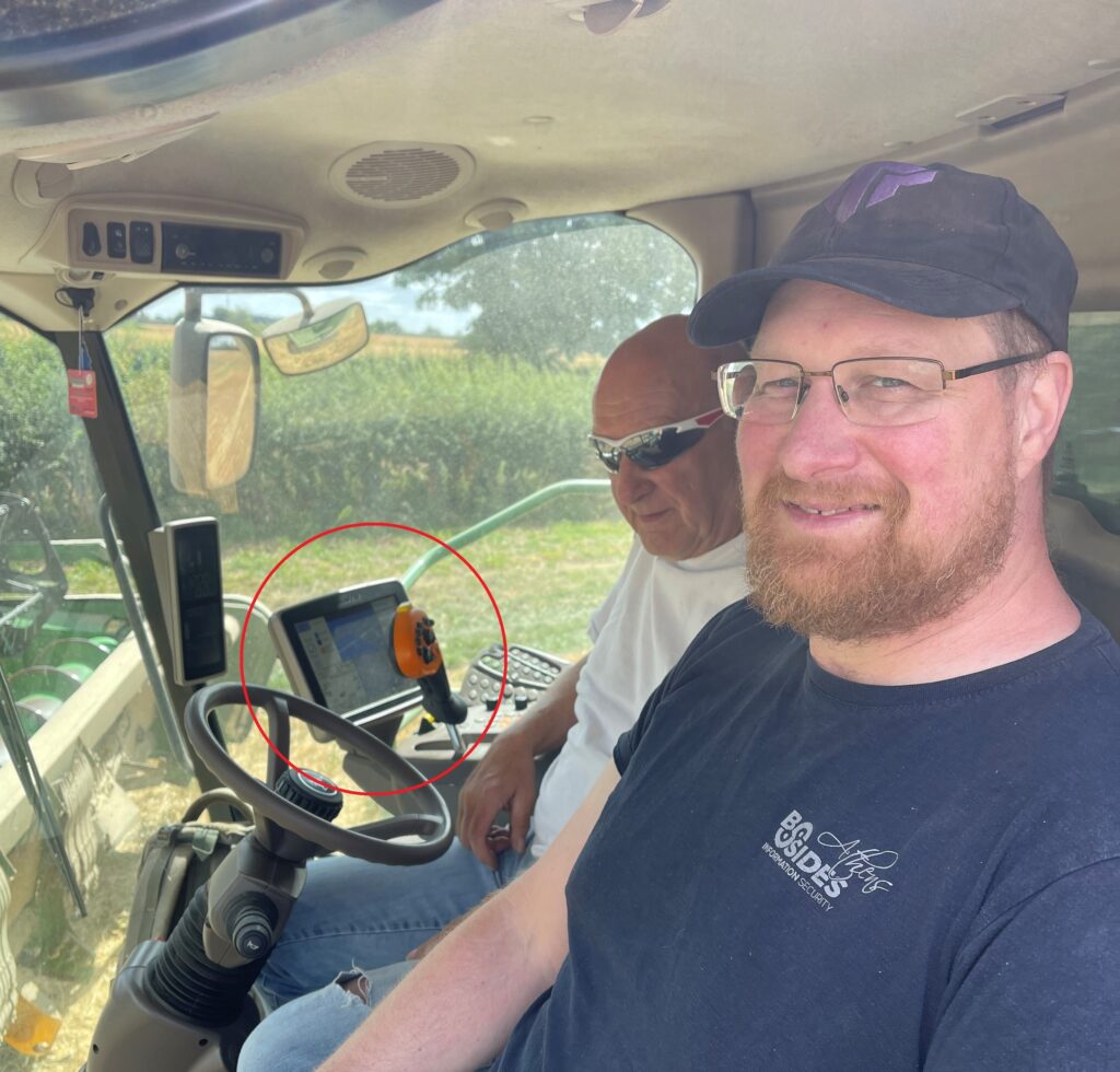 Whilst the opportunity to tamper with steering and other connectivity systems has potential, of most interest to me in that cab is the yield monitor, which you can see in the background of this photo featuring my colleague David Lodge: