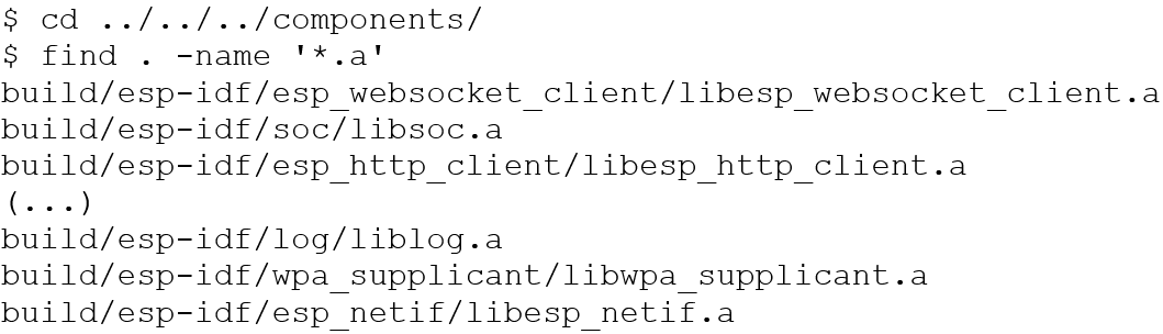 ESP-IDF builds as distinct components rather than a standalone binary. Each component is located in build/esp-idf/: