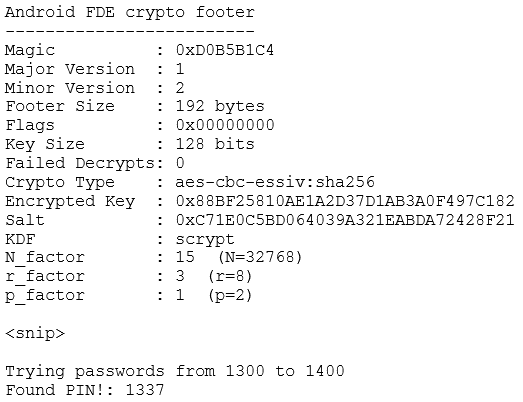 Extract key and the salt from the metadata partition and the userdata partition header, then brute it: