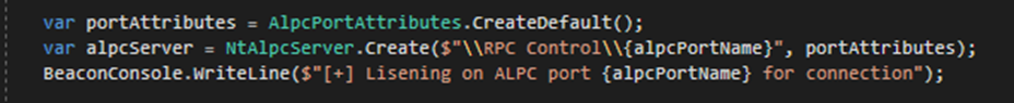 Once the custom ALPC endpoint is registered, the attacker can setup an ALPC port listening for incoming connections.