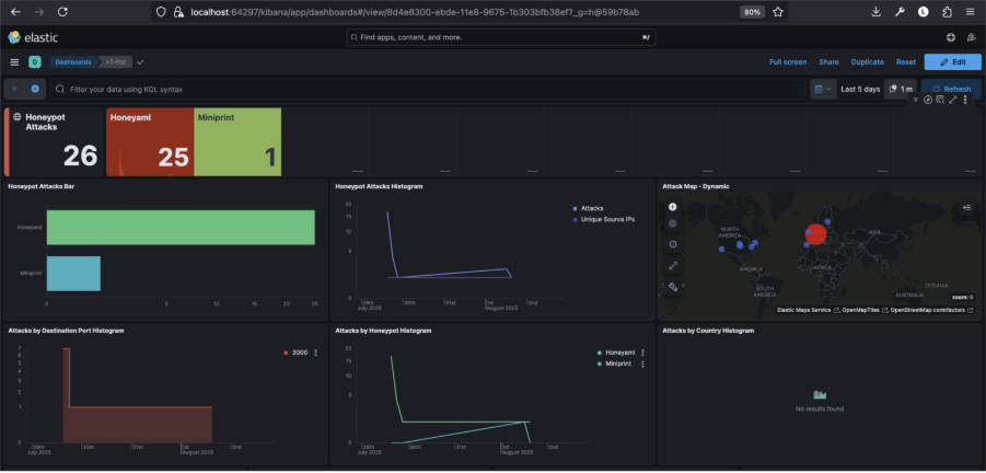 Once that was sorted, I installed T-Pot, which rolled out all the honeypot services I needed in Docker containers. I used Portainer to manage the containers and shipped all logs to an Elasticsearch instance for monitoring. From there, it was just a matter of making sure the box sat safely inside a DMZ and watching the alerts roll in.