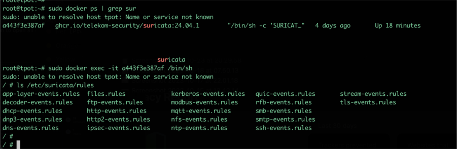 Once you’ve entered the Suricata container (as shown in the screenshot below), you’ll have access to the full set of Suricata rules under /etc/suricata/rules/.