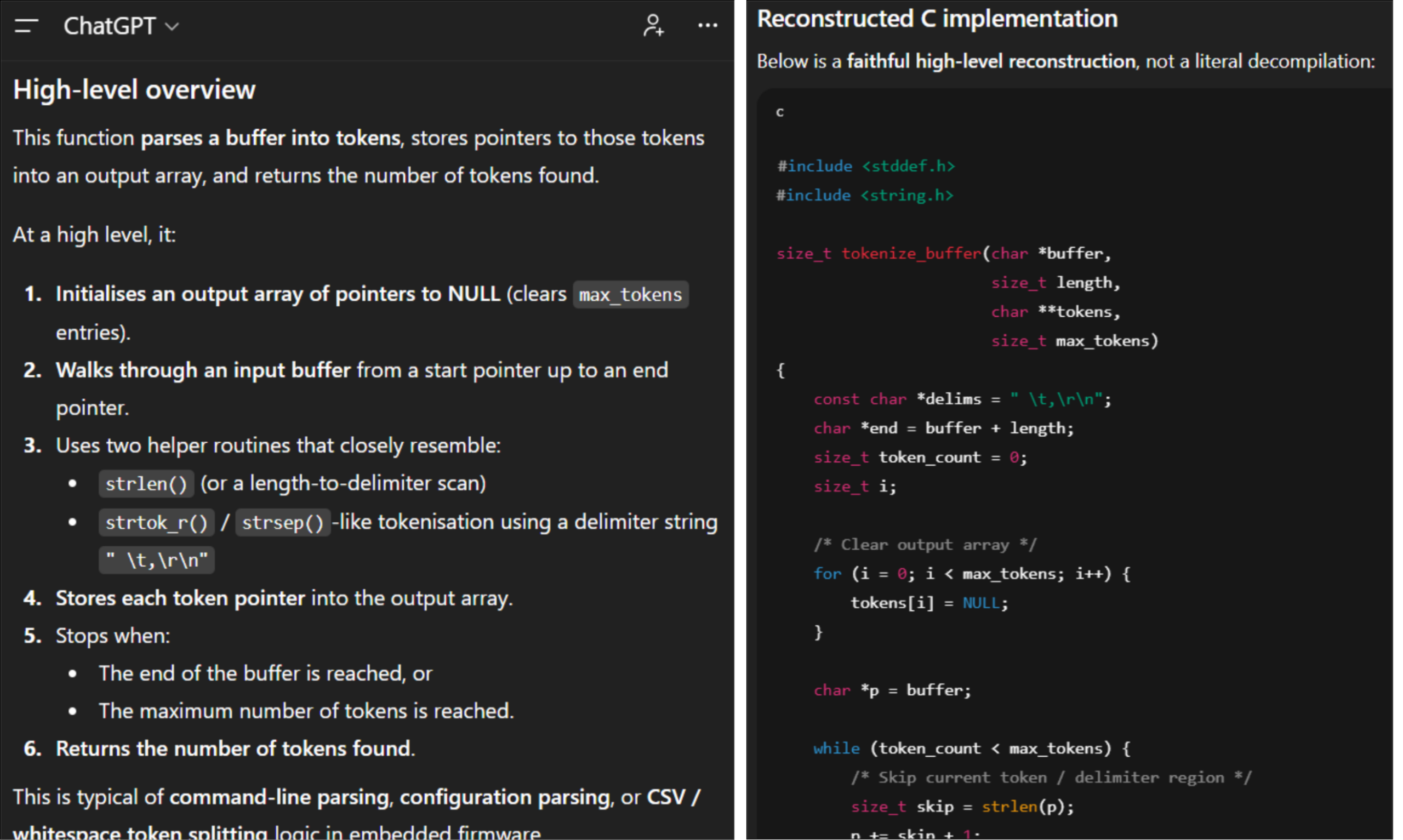 I often feed Ghidra disassembly and decompilations into LLMs. It’s great for quickly identifying common algorithms like memory allocation, checksums, and cryptographic routines. At its simplest, naively copy-pasting Ghidra output into a chatbot like ChatGPT with a simple prompt will provide good insights.