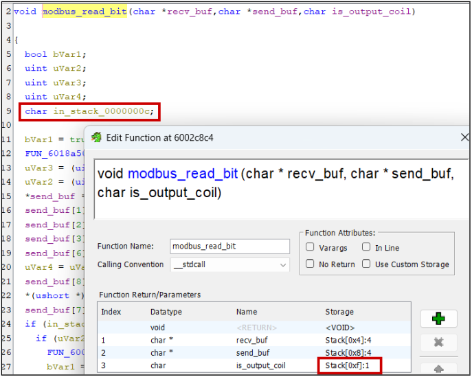 Warning signs can include the existence of “in_”, “in_stack_”, “unaff_”, and “extraout_” variables in the decompiler view.