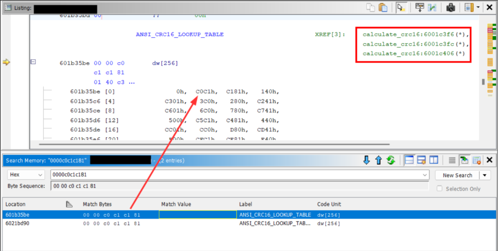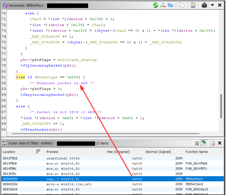A less obvious method of function identification. Use the memory and scalar searches for known constants like the DHCP magic cookie (0x63825363), ARP’s EtherType (0x0806), or the AES S-Box.