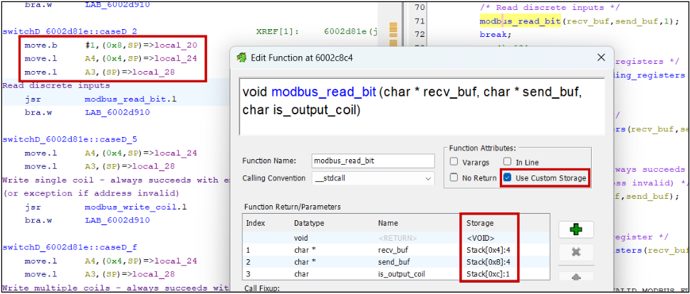 Without debug symbols, Ghidra fails to identify variadic and thiscall functions, e.g., printf(char *fmt, …) and object::method(). Set these manually in the Edit Function Signature window.