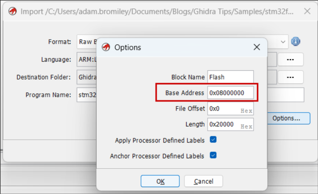 - The chip’s datasheet—e.g., it’s well documented that STM32s load firmware at 0x0800 0000.