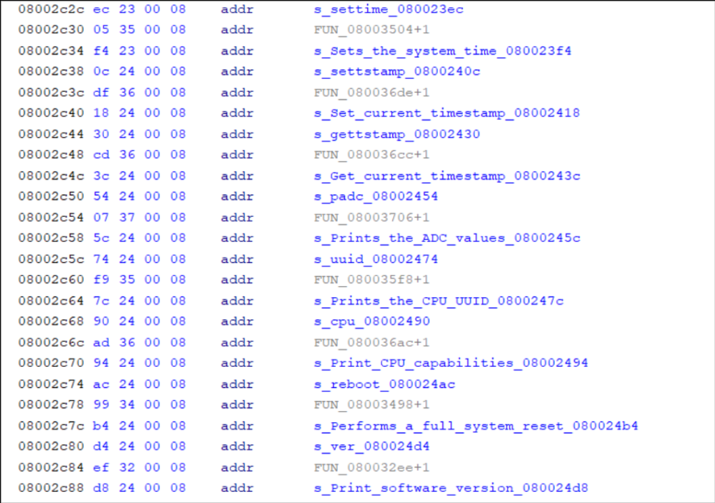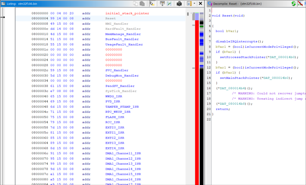 The table’s first record is typically the reset handler (or the second, if the first is an initial stack pointer). This is the firmware’s entry point. Disassembling the reset handler is a helpful precursor to running Auto Analysis, since it will run through most functions in the correct order of execution.