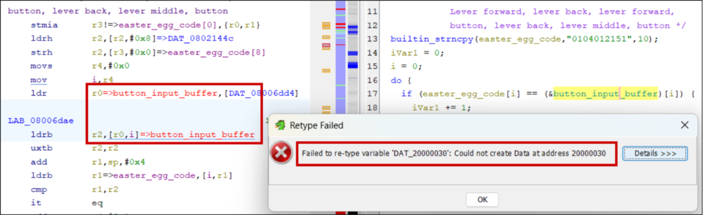 Labelling variables and correcting their datatypes (“Ctrl-l”) helps understand the decompilation, especially when returning to the project after a long weekend. You’ll reach the point where you reconstruct subroutines into compilable C snippets.