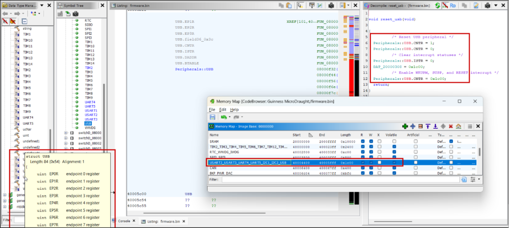 Try importing header files for libraries you know the firmware uses. Ghidra will populate the Data Type Manager with all typedefs, structs, and function prototypes. Preprocessor constants can annotate the decompilation with Set Equate… (key binding “e”).