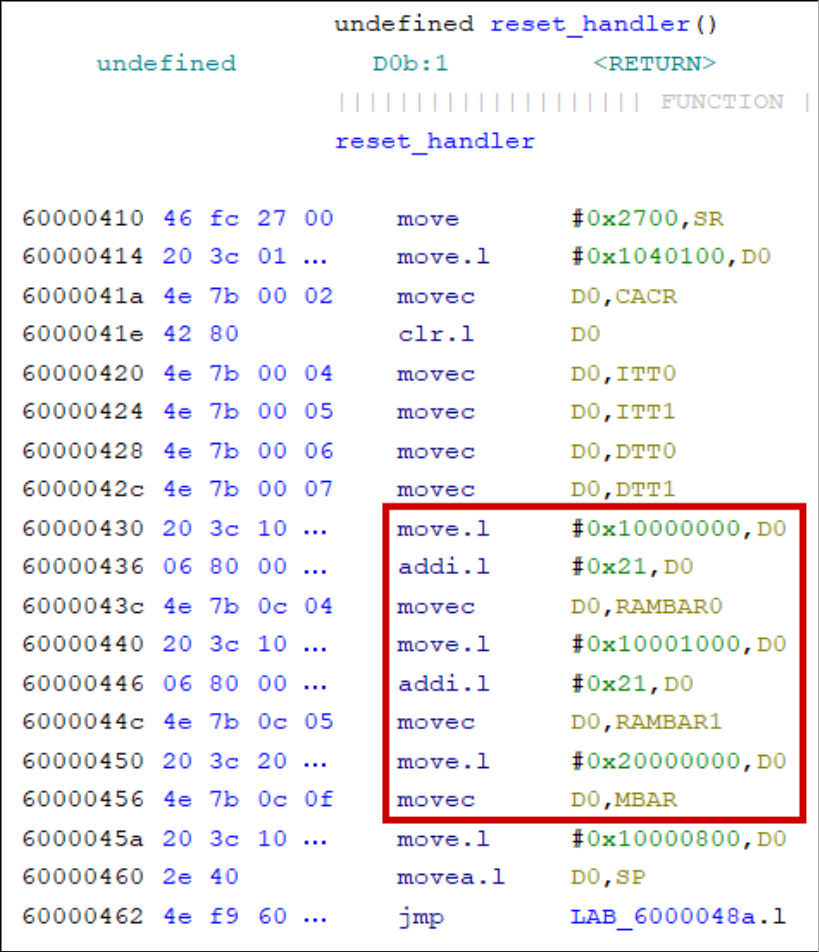M68000 processors have peripheral locations that depend on runtime-configured base address registers (VBR, RAMBAR, and MBAR). Look in the firmware’s initialisation sequence for how these are set:
