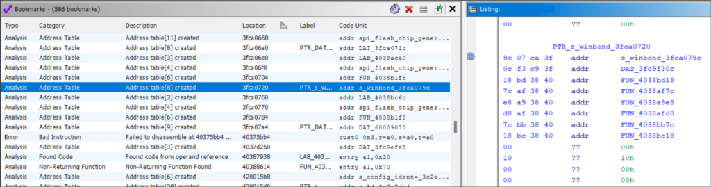 Ghidra populates the bookmark table during auto-analysis.