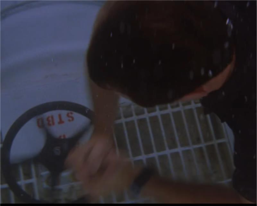 As the crew has lost control of the helm (ability to steer the ship), as a last resort the Patric character is directed to the bow thruster controls. These, of course, are underwater..