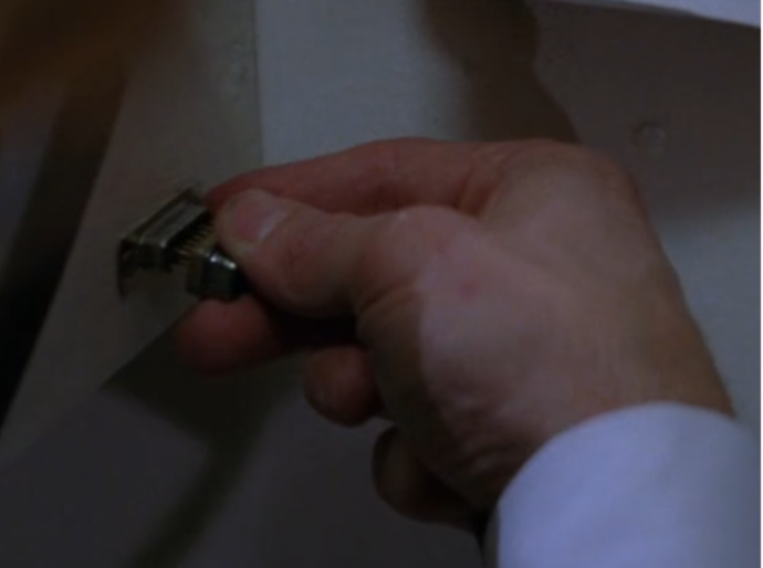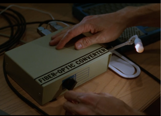 Now, I’m old enough to remember these boxes. They certainly aren’t fibre connectors – it’s a serial switch box with a ‘fibre connector’ sticker on it! Artistic licence++, yet there wasn’t any need to fake a fibre connection. An odd choice from the props department