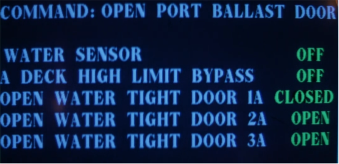 However, the movie shows opening ballast water doors to accessible deck areas! Ballast tanks would be sealed when at sea. They are only accessed infrequently for inspection and cleaning, through small covers secured with bolts.